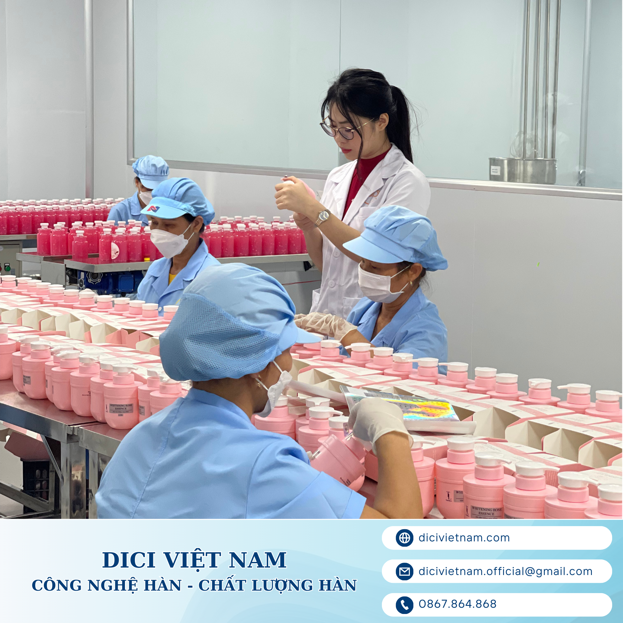 DICI Việt Nam chuyên gia công mỹ phẩm với quy trình chuẩn quốc tế, đáp ứng nhu cầu của đối tác về các sản phẩm mỹ phẩm an toàn, hiệu quả và được kiểm soát chất lượng nghiêm ngặt. Đội ngũ DICI luôn đồng hành cùng đối tác trên hành trình xây dựng thương hiệu riêng, từ thiết kế sản phẩm đến hỗ trợ pháp lý.